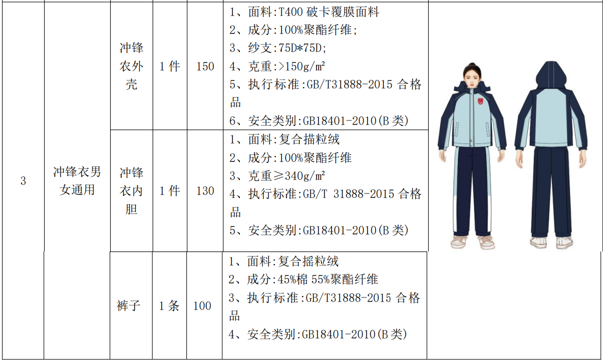 冬季套装(男女同款):计划每生1套,每套含冲锋衣1件(外壳+内胆),冬季长裤1件;